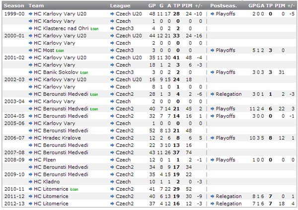 Występował m.in. w HC Berounsti Medvedi, HC Hradec Kralove, HC Plzen, HC Kladno a w ostatnie trzy lata reprezentował HC Litomierzyce. W ostatnim sezonie w 44 spotkaniach zanotował 5 goli i 18 asyst. Na ławce kar spędził 30 minut. W czeskiej Extralidze rozegrał 55 spotkań (3 gole, 4 asysty) a w 1. lidze czeskiej aż 458 meczów, w których zanotował 247 punktów (75 goli, 172 asyst).