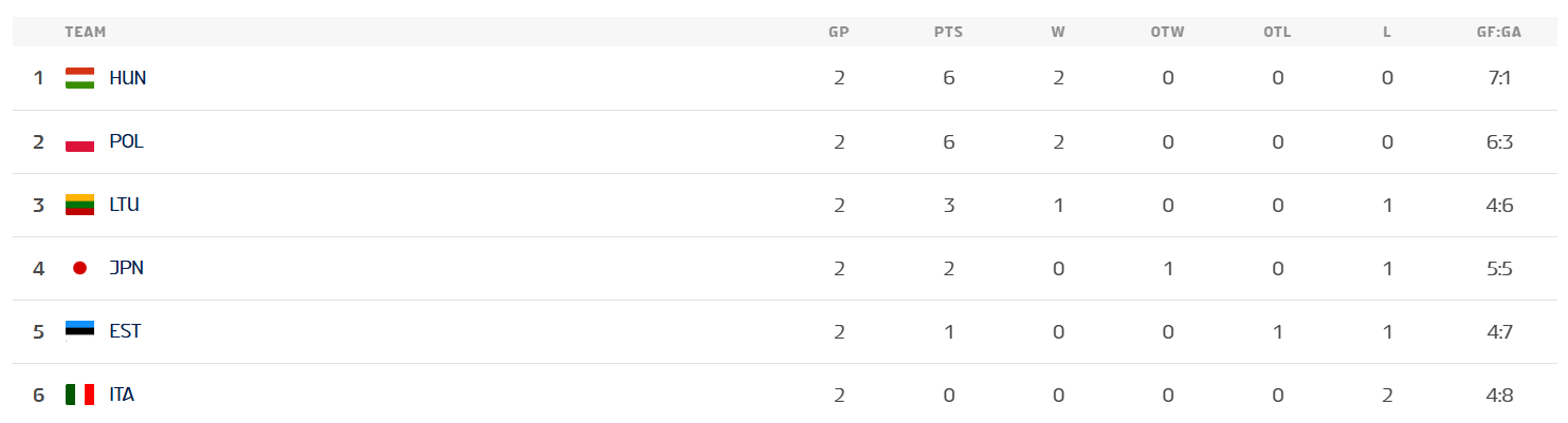 I to jedyne zespoły, które wygrały swoje oba mecze. Korzystniejszy bilans bramkowy mają Węgrzy, którzy okupują pierwszą lokatę, tuż za nimi znajdują się Polacy, a podium zamykają Litwini z trzema punktami. Taki rozkład punktów, znacząco przybliżył nas do utrzymania się w Dywizji IB. Chociaż cel jest nieco inny - awans.