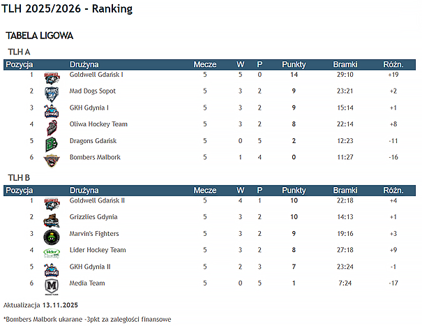 Zakończyła się pierwsza z trzech rund fazy zasadniczej 20. jubileuszowej edycji Trójmiejskiej Ligi Hokeja. W sezonie 2025/2026 rozegrano już 30 z 90 zaplanowanych spotkań w dwóch grupach – TLH A oraz TLH B. Początek rozgrywek przyniósł zarówno spodziewane rozstrzygnięcia, jak i kilka pierwszych niespodzianek.