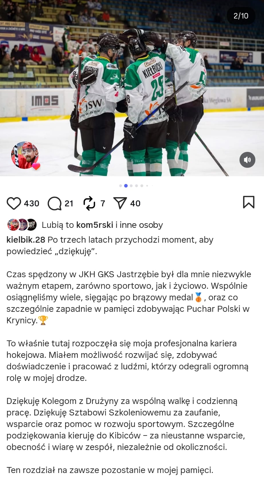 Niespełna 23-letni hokeista zdecydował się opublikować emocjonalne podziękowania dla klubu, kolegów z drużyny, sztabu szkoleniowego oraz kibiców.