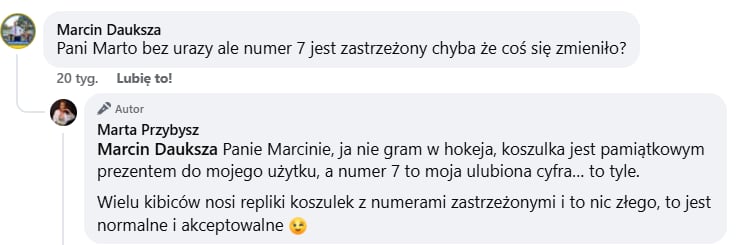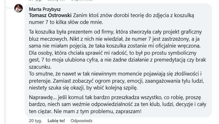 Co gorsza, to nie pierwsza kontrowersja związana z pamięcią o Piotrze Milanie za kadencji Marty Przybysz. W sierpniu 2024 roku, podczas Rodzinnego Pikniku Hokejowego na Błoniach w Sanoku, prezes klubu pojawiła się na scenie w bluzie z numerem 7 - tym samym, który jest zastrzeżony na cześć tragicznie zmarłego hokeisty.